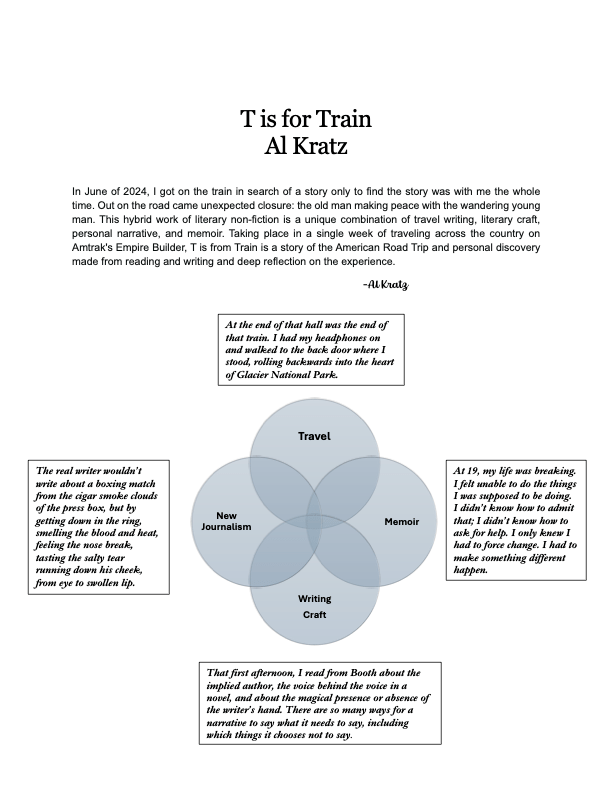 It’s here! I’m pleased to announce the release of T is for Train. I’m very happy with what this book has become. It started with the idea of writing about the trip here on my website, but I felt the scope gradually increase every day after getting back from my trip last summer. The result is a 55 page, 16,000 word, hybrid work that is part memoir, part travel writing, part writing craft, and part New Journalism.