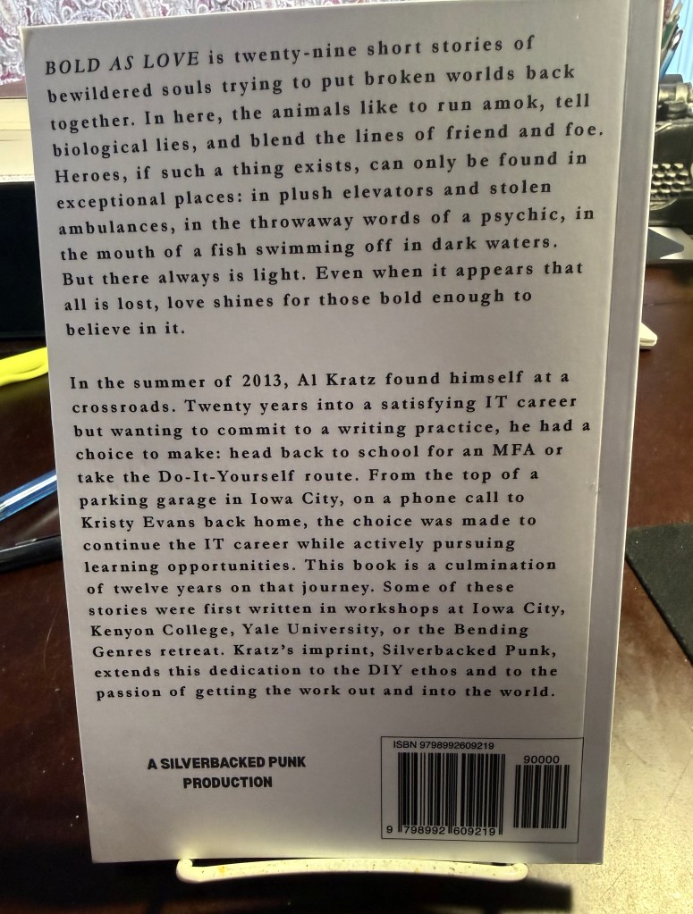 Bold as Love was released under my new imprint Silverbacked Punk. I did this book now partly to get more experience with the publishing processes so I would be ready for future projects, including one coming very soon. But I also did it because this book is definitive of the type of projects Silverbacked Punk stands for. Over the last ten years, I submitted many forms of a flash fiction collection or chapbook. I made a few short lists, a couple close calls, but found no home for the work. That’s part of the process. There are more books out there than can be published. I believe in the book. I believe in all the work that went into it. I wanted to have a physical representation of the work. I wanted to be able to share it with you. In the end, I don’t think there was a better home for it than Silverbacked Punk.